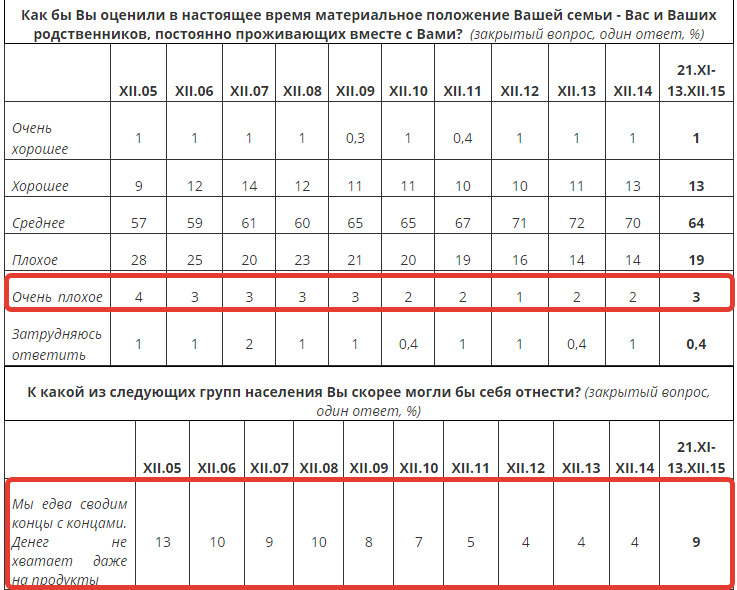Самооценка материального положения россиян в последнее десятилетие также улучшилась: доля семей с «плохим» или «очень плохим» материальным положением упала с 32% (в декабре 2005 г.) до 16% в декабре 2013 и 2014 гг. Ситуация начала меняться с декабря 2014 года: доля семей с «плохим» или «очень плохим» материальным положением к настоящему моменту выросла до 22%. При этом «хорошим» или «очень хорошим» свое материальное положение как год назад, так и сегодня называют 14%. Доля «средних» оценок выросла с 57% в декабре 2005 г. до 72% в декабре 2013 г., однако к декабрю 2015 г. снизилась до 64%. Вплоть до 2014 г. росли потребительские возможности: доля «бедных» семей (которым не хватает даже на еду и тем, кому достаточно средств на еду, но покупка одежды недоступна) снизилась вдвое – с 49% (в конце 2005 г.) до 22% в декабре 2014 г. Однако позже ситуация также начала ухудшаться и к настоящему моменту эта доля подскочила до 39%, вернувшись таким образом на уровень 2009 г. Среди людей пожилого возраста данные ответы встречаются существенно чаще (55%). Одновременно за год сократилось число тех, кто свободно может позволить себе покупку продуктов и одежды, однако испытывает затруднения с приобретением бытовой техники и предметов мебели (с 47% до 40%), а также тех, чьих доходов на это хватает, однако недостаточно для покупки автомобиля (с 27% до 16%). .