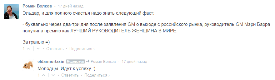 Концерн GM когда прекращал активность для Opel и Chevrolet в России мотивировал это плохими продажами, отсутствием перспектив на рынке и тому подобными вещами. Никакой политики в действиях General Motors не было. Решение было быстрым, очень странным и непонятным никому, включая сотрудников компании. У меня друзья обедали в тот день с менеджерами среднего звена Opel в России, им объявили о решении только ближе к вечеру, практически сразу с официальным заявлением. У всех был шок. Несмотря на то, что конкуренция в России достаточно сильна, это один из ключевых рынков в Европе, как по размеру, так и выручке.